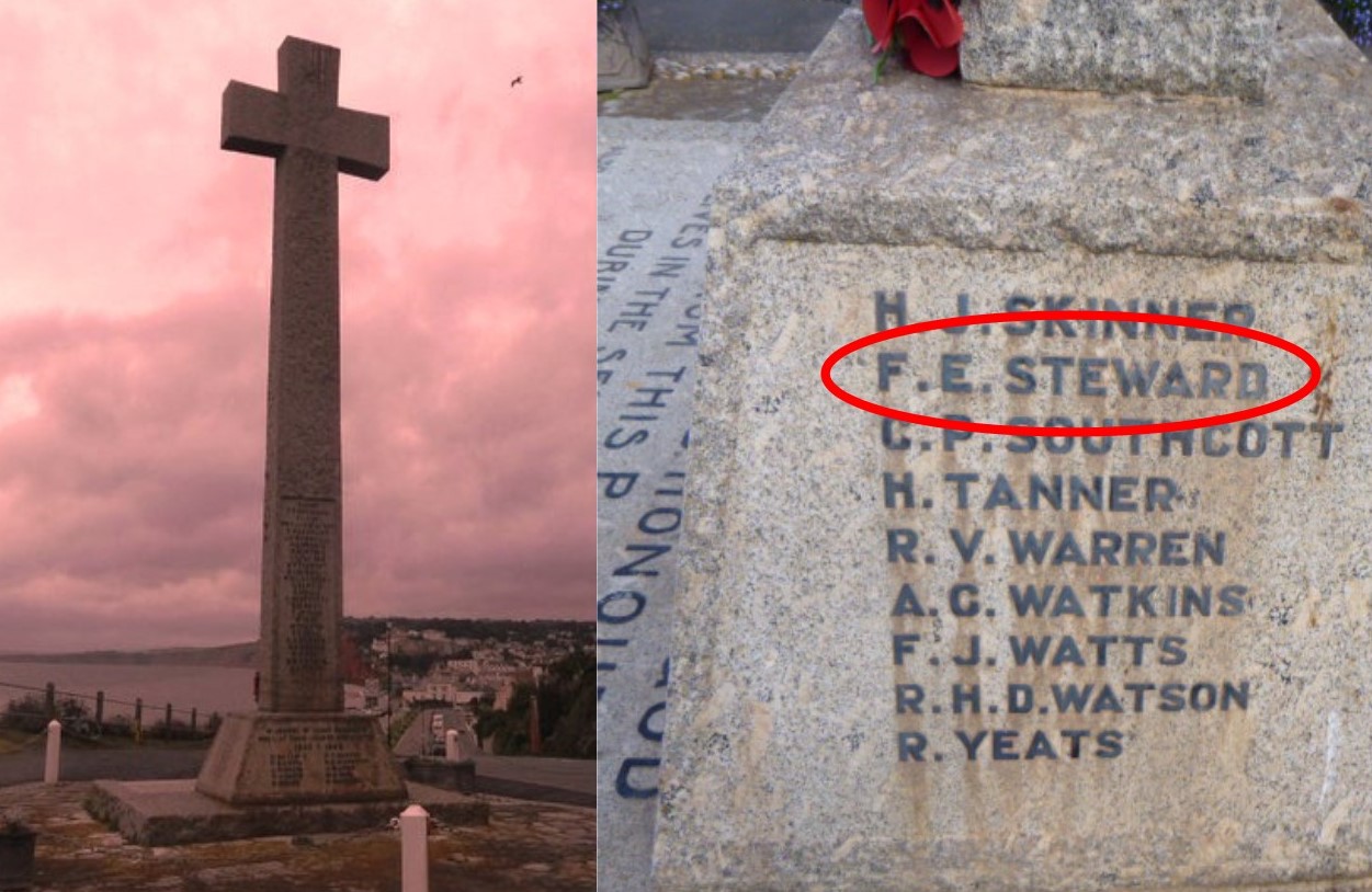 Both the CWGC record and the Devon Heritage research confirm that Francis was a married man and that his wife was Phyllis Margaret Doreen Steward, née Pyne ‘of Budleigh Salterton’. The Pyne family was and is well known locally and would have been proud to see his name on the War Memorial.